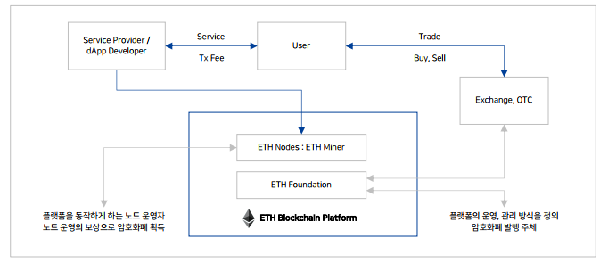 그림을 보시면 이더리움 재단에서 이더리움을 발행하였으며 채굴자들 플랫폼을 동작하게 하는 과정을 통해 보상을 획득하고 개인들은 서비스를 제공받아서 트랜젝션 수수료를 제공하거나 거래소 혹은 otc 거래로 코인을 구매하게 됩니다.